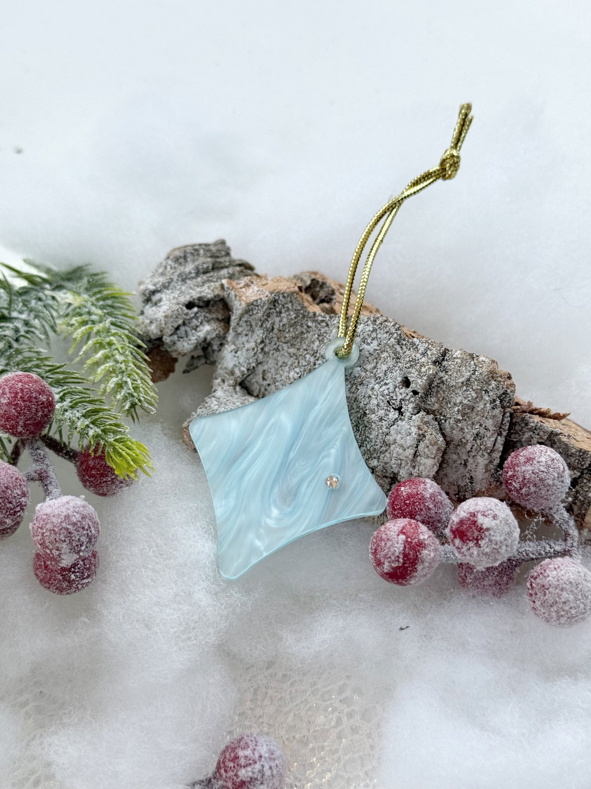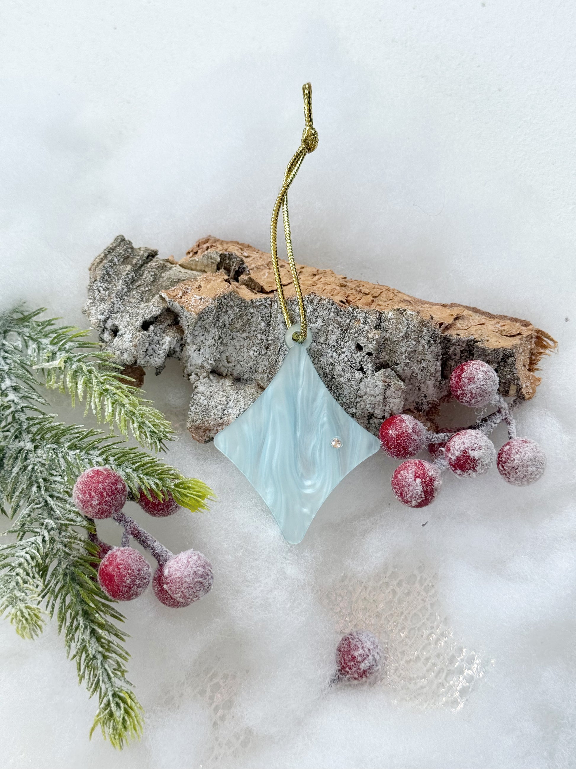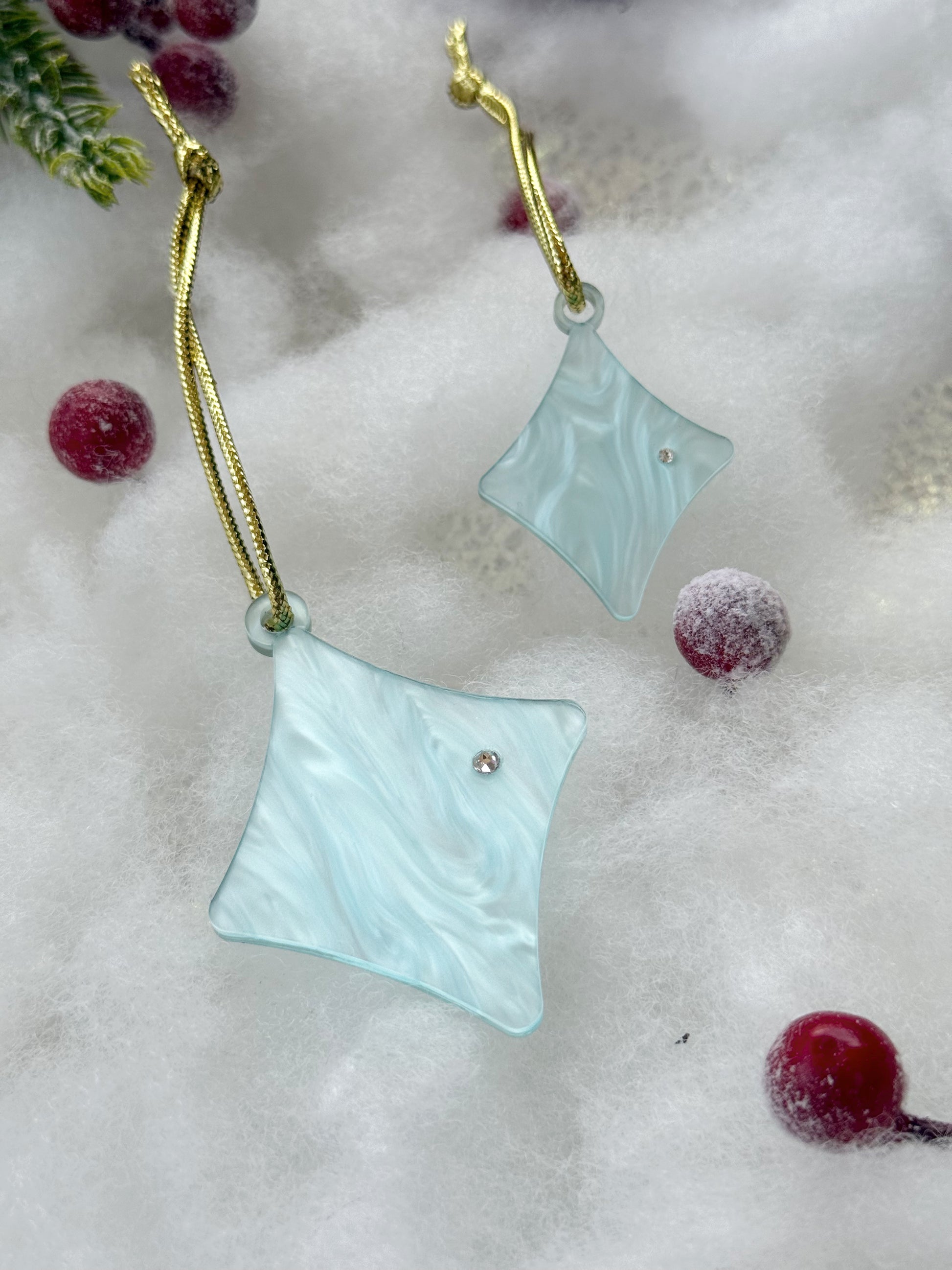 Material: Metacrilato azul hielo nacarado y decoración en cristales de Swarovski